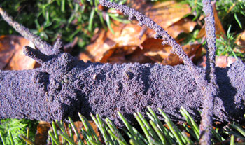 Schneeflöhe als violetter Überzug für einen Baumast.