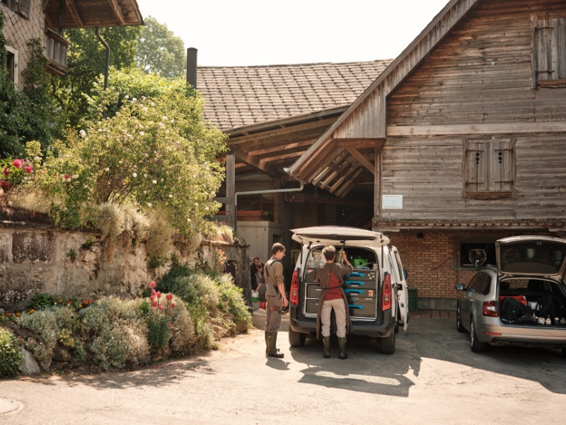 Christen studiert im fünften Jahr Veterinärmedizin mit Schwerpunkt Nutztiere an der Vetsuisse-Fakultät der Universität Bern, und an diesem warmen Junimorgen ist sie mit zwei erfahrenen Tierärztinnen der Nutztierpraxis Bern (NTB) unterwegs: Evi Studer und Isabelle Rediger. Studer ist Leiterin der Nutztierpraxis, die 2023 an der Wiederkäuerklinik der Vetsuisse-Fakultät der Universität Bern ins Leben gerufen wurde. Rediger hilft seit Sommer 2024 jeden Donnerstag aus und wird demnächst ihr Pensum aufstocken: Die Nutztierpraxis Bern ist gut angelaufen, sodass Verstärkung nötig ist.