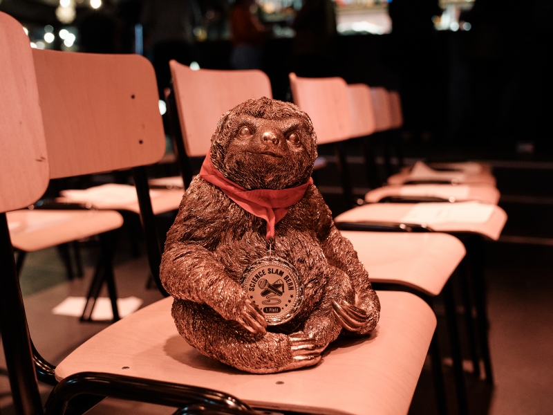 Um den Tagessieg kämpften sechs «Slammys». Zu gewinnen gab es «kein Geld», wie Moderatorin Nicola von Greyerz scherzhaft rief: «Genau wie in der Forschung!» Stattdessen kämpften die Slammys traditionsgemäss um einen goldenen Tier-Pokal, beim dritten Science Slam in der Form eines goldenen Faultiers. Wie in den Vorjahren wurde der Science Slam von «Alumni UniBE» gemeinsam mit Philippe Bähler von der Berner Fachhochschule BFH und zahlreichen Sponsoren organisiert.